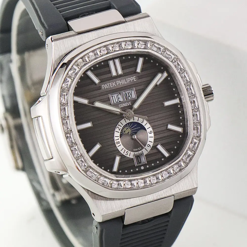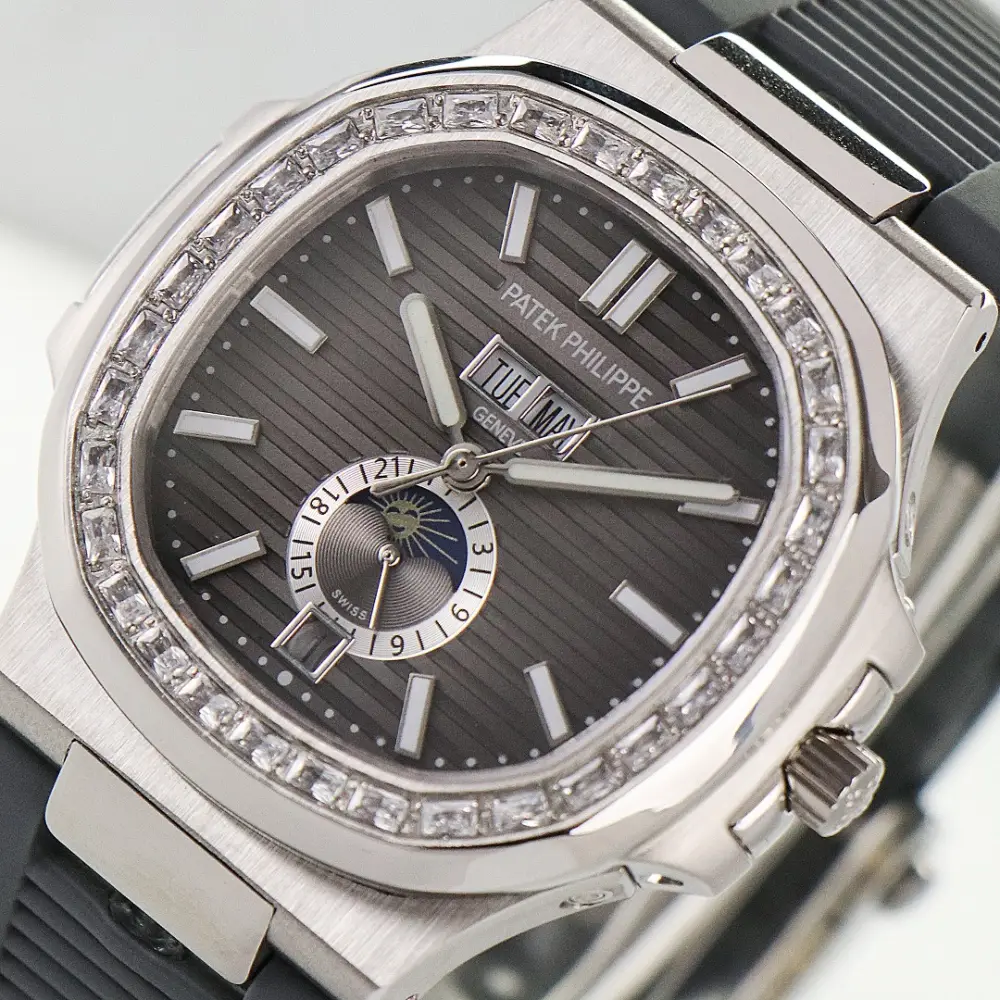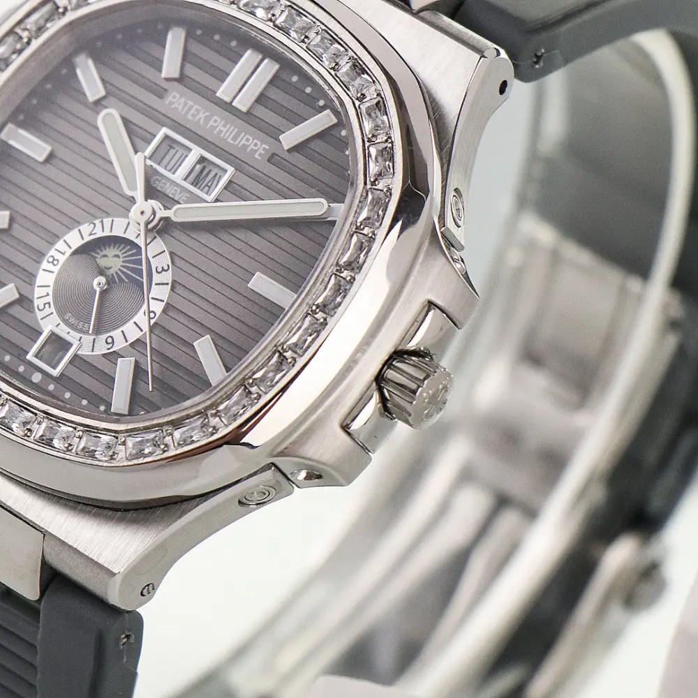 The brushed stainless steel case keeps the Nautilus DNA intact — clean, architectural, unmistakable. The factory-set diamond bezel adds a subtle edge: not flashy, not excessive, just enough to signal that this isn’t a standard configuration.