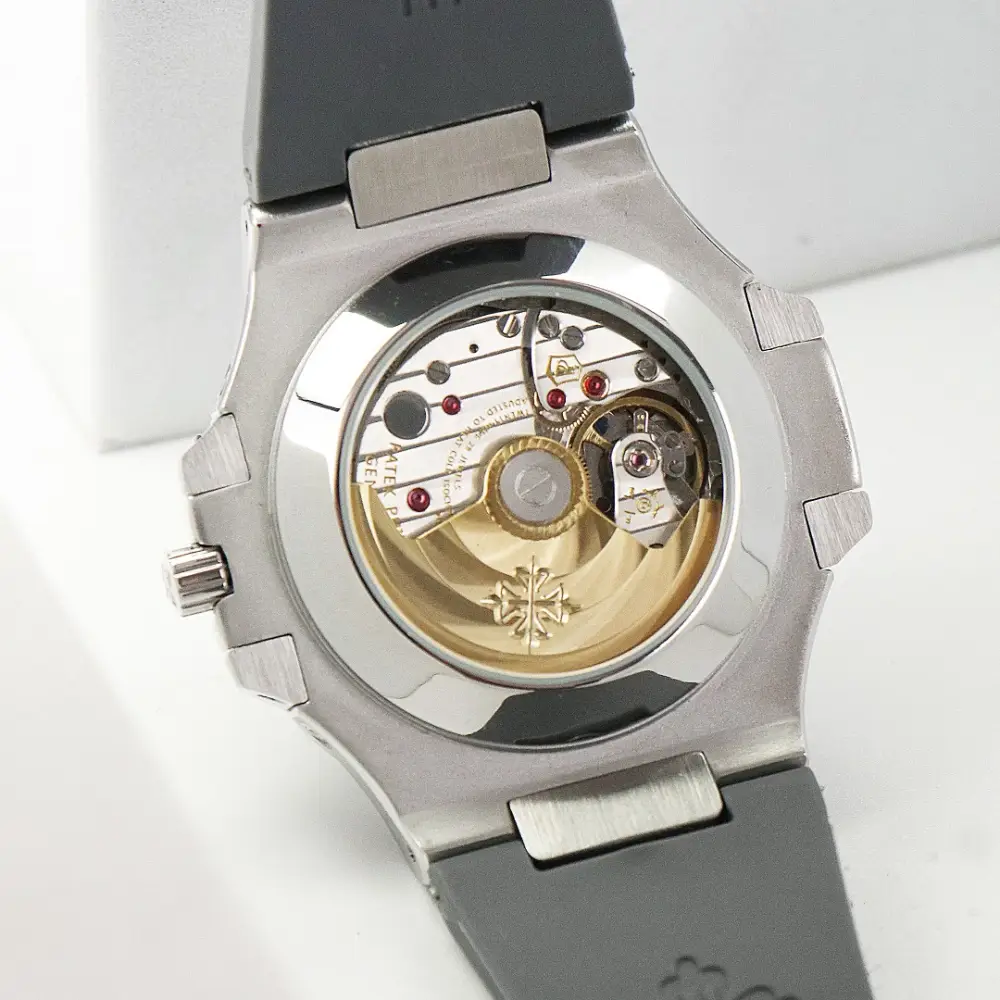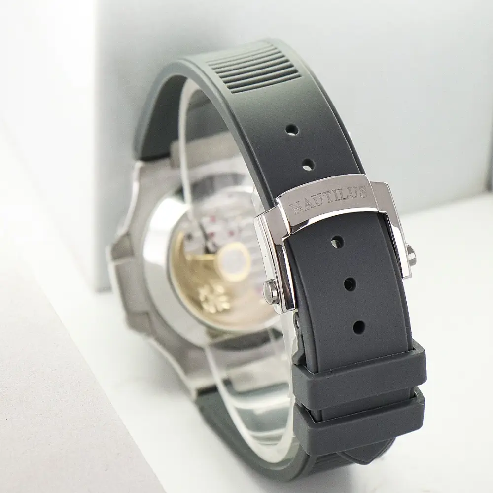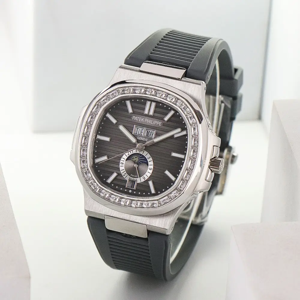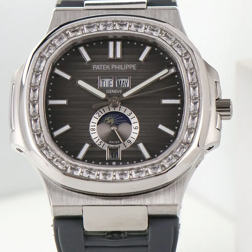 The brushed stainless steel case keeps the Nautilus DNA intact — clean, architectural, unmistakable. The factory-set diamond bezel adds a subtle edge: not flashy, not excessive, just enough to signal that this isn’t a standard configuration.