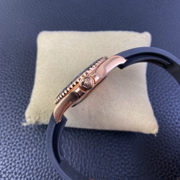 Behold the commanding black Oysterflex bracelet. This isn’t just rubber; it’s a patented Rolex innovation with a flexible metal blade inside, wrapped in ultra-resilient elastomer. It’s as sophisticated as it is tough.